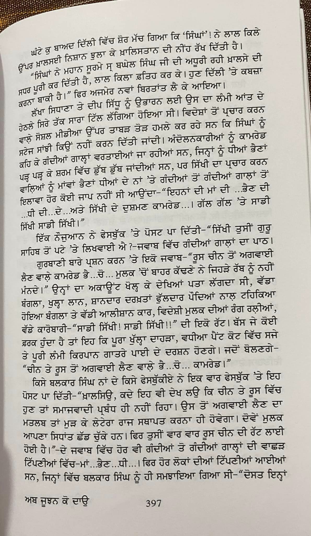 ਅੰਦੋਲਨਕਾਰੀਆਂ ਨੂੰ ਕਾਮਰੇਡ ਕਹਿ ਕੇ ਗੰਦੀਆਂ ਗਾਲ੍ਹਾਂ ਵਰਤਾਈਆਂ ਜਾ ਰਹੀਆਂ ਸਨ, ਜਿਨ੍ਹਾਂ ਨੂੰ ਧੀਆਂ ਭੈਣਾਂ ਪੜ੍ਹ ਪੜ੍ਹ ਕੇ ਸ਼ਰਮ ਵਿੱਚ ਡੁੱਬ ਡੁੱਬ ਜਾਂਦੀਆਂ ਸਨ, ਪਰ ਸਿੱਖੀ ਦਾ ਪ੍ਰਚਾਰ ਕਰਨ ਵਾਲਿਆਂ ਨੂੰ ਮਾਂਵਾਂ ਭੈਣਾਂ ਧੀਆਂ ਦੇ ਨਾਂ 'ਤੇ ਗੰਦੀਆਂ ਤੋਂ ਗੰਦੀਆਂ ਗਾਲਾਂ ਤੋਂ ਇਲਾਵਾ ਹੋਰ ਕੋਈ ਜਾਪ ਨਹੀਂ ਸੀ ਆਉਂਦਾ-“ਇਹਨਾਂ ਦੀ ਮਾਂ ਦੀ ... ਭੈਣ ਦੀ ਧੀ ਦੀ ਦੇ...ਅਤੇ ਸਿੱਖੀ ਦੇ ਦੁਸ਼ਮਣ ਕਾਮਰੇਡ...। ਗੱਲ ਗੱਲ 'ਤੇ ਸਾਡੀ ਸਿੱਖੀ ਸਾਡੀ ਸਿੱਖੀ।