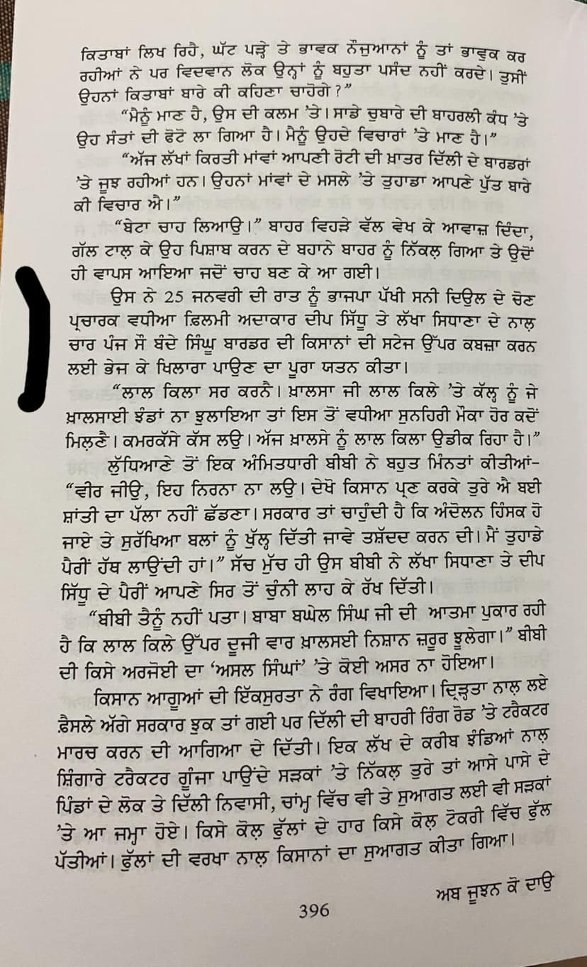 ਵੈਸੇ ਤਾਂ ਨਾਵਲਕਾਰ ਅਤਰਜੀਤ ਨੇ 'ਅਬ ਜੂਝਨ ਕੋ ਦਾਉ' ਨਾਵਲ ਵਿੱਚ ਇਤਿਹਾਸ ਦੇ ਨਾਂ 'ਤੇ ਝੂਠ ਵੰਡਿਆ ਹੈ, ਪਰ 396 ਤੋਂ 399 ਪੰਨਿਆਂ ਵਿੱਚੋਂ ਕੁਝ ਅੰਸ਼ ਆਪ ਨਾਲ ਸਾਂਝੇ ਕਰ ਰਹੇ ਹਾਂ! “ਬੇਟਾ ਚਾਹ ਲਿਆਉ।” ਬਾਹਰ ਵਿਹੜੇ ਵੱਲ ਵੇਖ ਕੇ ਆਵਾਜ਼ ਦਿੰਦਾ, ਗੱਲ ਟਾਲ ਕੇ ਉਹ ਪਿਸ਼ਾਬ ਕਰਨ ਦੇ ਬਹਾਨੇ ਬਾਹਰ ਨੂੰ ਨਿੱਕਲ ਗਿਆ ਤੇ ਉਦੋਂ ਹੀ ਵਾਪਸ ਆਇਆ ਜਦੋਂ ਚਾਹ ਬਣ ਕੇ ਆ ਗਈ। ਉਸ ਨੇ 25 ਜਨਵਰੀ ਦੀ ਰਾਤ ਨੂੰ ਭਾਜਪਾ ਪੱਖੀ ਸਨੀ ਦਿਉਲ ਦੇ ਚੋਣ ਪ੍ਰਚਾਰਕ ਵਧੀਆਫ਼ਿਲਮੀ ਅਦਾਕਾਰ ਦੀਪ ਸਿੱਧੂ ਤੇ ਲੱਖਾ ਸਿਧਾਣਾ ਦੇ ਨਾਲ ਚਾਰ ਪੰਜ ਸੌ ਬੰਦੇ ਸਿੰਘ ਬਾਰਡਰ ਦੀ ਕਿਸਾਨਾਂ ਦੀ ਸਟੇਜ ਉੱਪਰ ਕਬਜ਼ਾ ਕਰਨ ਲਈ ਭੇਜ ਕੇ ਖਿਲਾਰਾ ਪਾਉਣ ਦਾ ਪੂਰਾ ਯਤਨ ਕੀਤਾ।