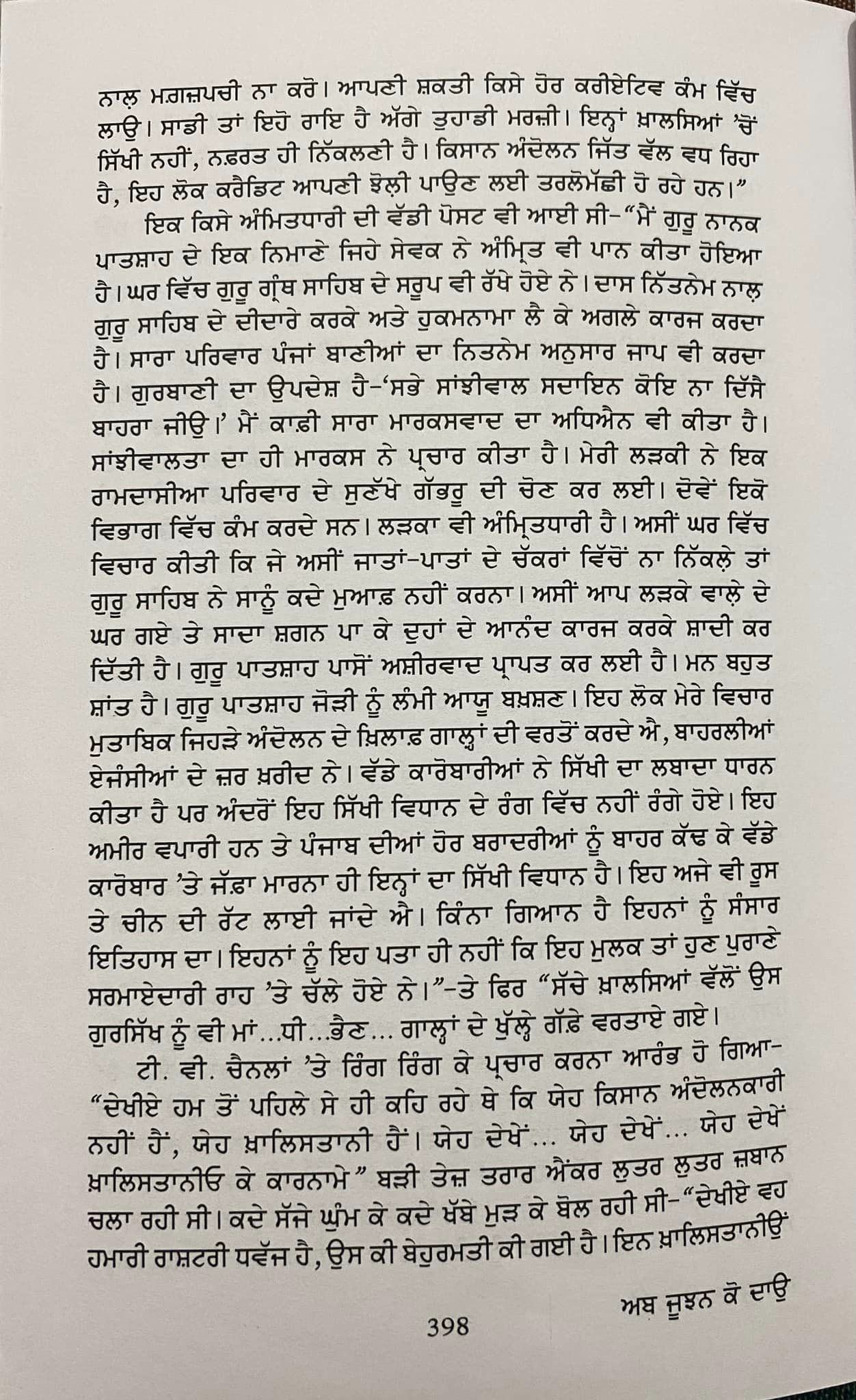 "ਮੈਂ ਗੁਰੂ ਨਾਨਕ ਪਾਤਸ਼ਾਹ ਦੇ ਇਕ ਨਿਮਾਣੇ ਜਿਹੇ ਸੇਵਕ ਨੇ ਅੰਮ੍ਰਿਤ ਵੀ ਪਾਨ ਕੀਤਾ ਹੋਇਆ ਹੈ। ਘਰ ਵਿੱਚ ਗੁਰੂ ਗ੍ਰੰਥ ਸਾਹਿਬ ਦੇ ਸਰੂਪ ਵੀ ਰੱਖੇ ਹੋਏ ਨੇ। ਦਾਸ ਨਿੱਤਨੇਮ ਨਾਲ ਗੁਰੂ ' ਸਾਹਿਬ ਦੇ ਦੀਦਾਰੇ ਕਰਕੇ ਅਤੇ ਹੁਕਮਨਾਮਾ ਲੈ ਕੇ ਅਗਲੇ ਕਾਰਜ ਕਰਦਾ ਹੈ। ਸਾਰਾ ਪਰਿਵਾਰ ਪੰਜਾਂ ਬਾਣੀਆਂ ਦਾ ਨਿਤਨੇਮ ਅਨੁਸਾਰ ਜਾਪ ਵੀ ਕਰਦਾ ਹੈ। ਗੁਰਬਾਣੀ ਦਾ ਉਪਦੇਸ਼ ਹੈ-ਸਭੇ ਸਾਂਝੀਵਾਲ ਸਦਾਇਨ ਕੋਇ ਨਾ ਦਿੱਸੇ ਬਾਹਰਾ ਜੀਉ।' ਮੈਂ ਕਾਫ਼ੀ ਸਾਰਾ ਮਾਰਕਸਵਾਦ ਦਾ ਅਧਿਐਨ ਵੀ ਕੀਤਾ ਹੈ। ਸਾਂਝੀਵਾਲਤਾ ਦਾ ਹੀ ਮਾਰਕਸ ਨੇ ਪ੍ਰਚਾਰ ਕੀਤਾ ਹੈ। ਮੇਰੀ ਲੜਕੀ ਨੇ ਇਕ ਰਾਮਦਾਸੀਆ ਪਰਿਵਾਰ ਦੇ ਸੁਣੱਖੇ ਗੱਭਰੂ ਦੀ ਚੋਣ ਕਰ ਲਈ। ਦੋਵੇਂ ਇਕੋ ਵਿਭਾਗ ਵਿੱਚ ਕੰਮ ਕਰਦੇ ਸਨ। ਲੜਕਾ ਵੀ ਅੰਮ੍ਰਿਤਧਾਰੀ ਹੈ। ਅਸੀਂ ਘਰ ਵਿੱਚ ਵਿਚਾਰ ਕੀਤੀ ਕਿ ਜੇ ਅਸੀਂ ਜਾਤਾਂ-ਪਾਤਾਂ ਦੇ ਚੱਕਰਾਂ ਵਿੱਚੋਂ ਨਾ ਨਿੱਕਲੇ' ਤਾਂ ਗੁਰੂ ਸਾਹਿਬ ਨੇ ਸਾਨੂੰ ਕਦੇ ਮੁਆਫ਼ ਨਹੀਂ ਕਰਨਾ। ਅਸੀਂ ਆਪ ਲੜਕੇ ਵਾਲੇ ਦੇ ਘਰ ਗਏ ਤੇ ਸਾਦਾ ਸ਼ਗਨ ਪਾ ਕੇ ਦੁਹਾਂ ਦੇ ਆਨੰਦ ਕਾਰਜ ਕਰਕੇ ਸ਼ਾਦੀ ਕਰ ਦਿੱਤੀ ਹੈ। ਗੁਰੂ ਪਾਤਸ਼ਾਹ ਪਾਸੋਂ ਅਸ਼ੀਰਵਾਦ ਪ੍ਰਾਪਤ ਕਰ ਲਈ ਹੈ। ਮਨ ਬਹੁਤ ਸ਼ਾਂਤ ਹੈ। ਗੁਰੂ ਪਾਤਸ਼ਾਹ ਜੋੜੀ ਨੂੰ ਲੰਮੀ ਆਯੂ ਬਖ਼ਸ਼ਣ। ਇਹ ਲੋਕ ਮੇਰੇ ਵਿਚਾਰ ਮੁਤਾਬਿਕ ਜਿਹੜੇ ਅੰਦੋਲਨ ਦੇ ਖ਼ਿਲਾਫ਼ ਗਾਲ੍ਹਾਂ ਦੀ ਵਰਤੋਂ ਕਰਦੇ ਐ, ਬਾਹਰਲੀਆਂ ਏਜੰਸੀਆਂ ਦੇ ਜ਼ਰ ਖ਼ਰੀਦ ਨੇ। ਵੱਡੇ ਕਾਰੋਬਾਰੀਆਂ ਨੇ ਸਿੱਖੀ ਦਾ ਲਬਾਦਾ ਧਾਰਨ ਕੀਤਾ ਹੈ ਪਰ ਅੰਦਰੋਂ ਇਹ ਸਿੱਖੀ ਵਿਧਾਨ ਦੇ ਰੰਗ ਵਿੱਚ ਨਹੀਂ ਰੰਗੇ ਹੋਏ। ਇਹ ਅਮੀਰ ਵਪਾਰੀ ਹਨ ਤੇ ਪੰਜਾਬ ਦੀਆਂ ਹੋਰ ਬਰਾਦਰੀਆਂ ਨੂੰ ਬਾਹਰ ਕੱਢ ਕੇ ਵੱਡੇ ਕਾਰੋਬਾਰ 'ਤੇ ਜੱਫ਼ਾ ਮਾਰਨਾ ਹੀ ਇਨ੍ਹਾਂ ਦਾ ਸਿੱਖੀ ਵਿਧਾਨ ਹੈ। ਇਹ ਅਜੇ ਵੀ ਰੂ ਤੇ ਚੀਨ ਦੀ ਰੱਟ ਲਾਈ ਜਾਂਦੇ ਐ। ਕਿੰਨਾ ਗਿਆਨ ਹੈ ਇਹਨਾਂ ਨੂੰ ਸੰਸਾਰ ਇਤਿਹਾਸ ਦਾ। ਇਹਨਾਂ ਨੂੰ ਇਹ ਪਤਾ ਹੀ ਨਹੀਂ ਕਿ ਇਹ ਮੁਲਕ ਤਾਂ ਹੁਣ ਪੁਰਾਣੇ ਸਰਮਾਏਦਾਰੀ ਰਾਹ 'ਤੇ ਚੱਲੇ ਹੋਏ ਨੇ।"